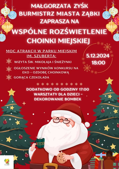 Dla dzieci przygotowaliśmy warsztaty dekorowania bombek (od godziny 17.00), a dla wszystkich gorącą czekoladę  i możliwość spotkania ze Świętym Mikołajem, który z pewnością nie odmówi pamiątkowego zdjęcia! Dodatkowo podczas wydarzenia zostaną ogłoszone wyniki konkursu na eko-ozdobę choinkową – informuje UM Ząbki