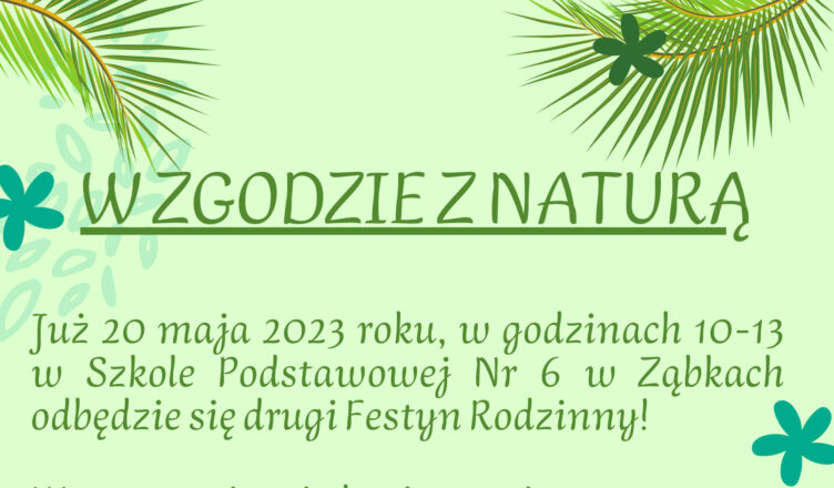 20 maja w Szkole Podstawowej nr 6 przy ul. Dzikiej w Ząbkach, odbędzie się Festyn Rodzinny pod hasłem „W zgodzie z naturą”.