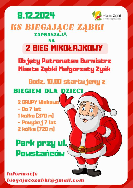 Ząbki ponownie staną się areną wyjątkowego wydarzenia, które połączy sport, radość i świąteczny nastrój. 8 grudnia 2024 roku odbędzie się 2. Bieg Mikołajkowy, organizowany przez klub sportowy „Biegające Ząbki” pod patronatem Burmistrz Miasta Ząbki, Małgorzaty Zyśk. Impreza, odbędzie się w malowniczym Parku przy ul. Powstańców, to doskonała okazja do aktywnego spędzenia czasu w gronie rodziny i przyjaciół. Wydarzenie łączy sportową aktywność z magią zbliżających się świąt.