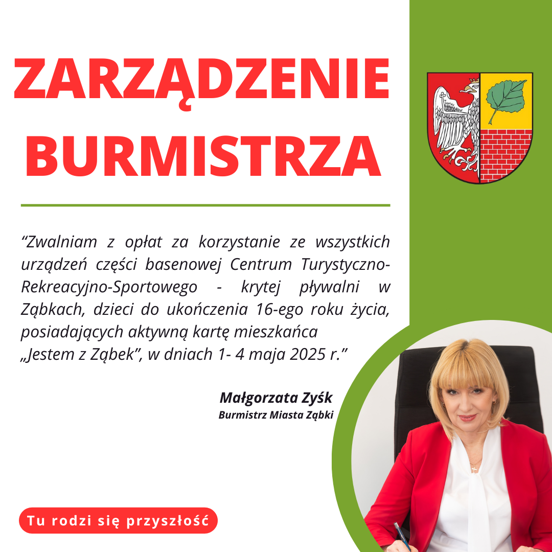 Decyzją Małgorzaty Zyśk Burmistrza Ząbek w dniach 1-4 maja 2025 r. dzieci do ukończenia 16 roku życia, posiadające aktywną kartę mieszkańca „Jestem z Ząbek” będą mogły nieodpłatnie korzystać z części basenowej miejskiej pływalni!