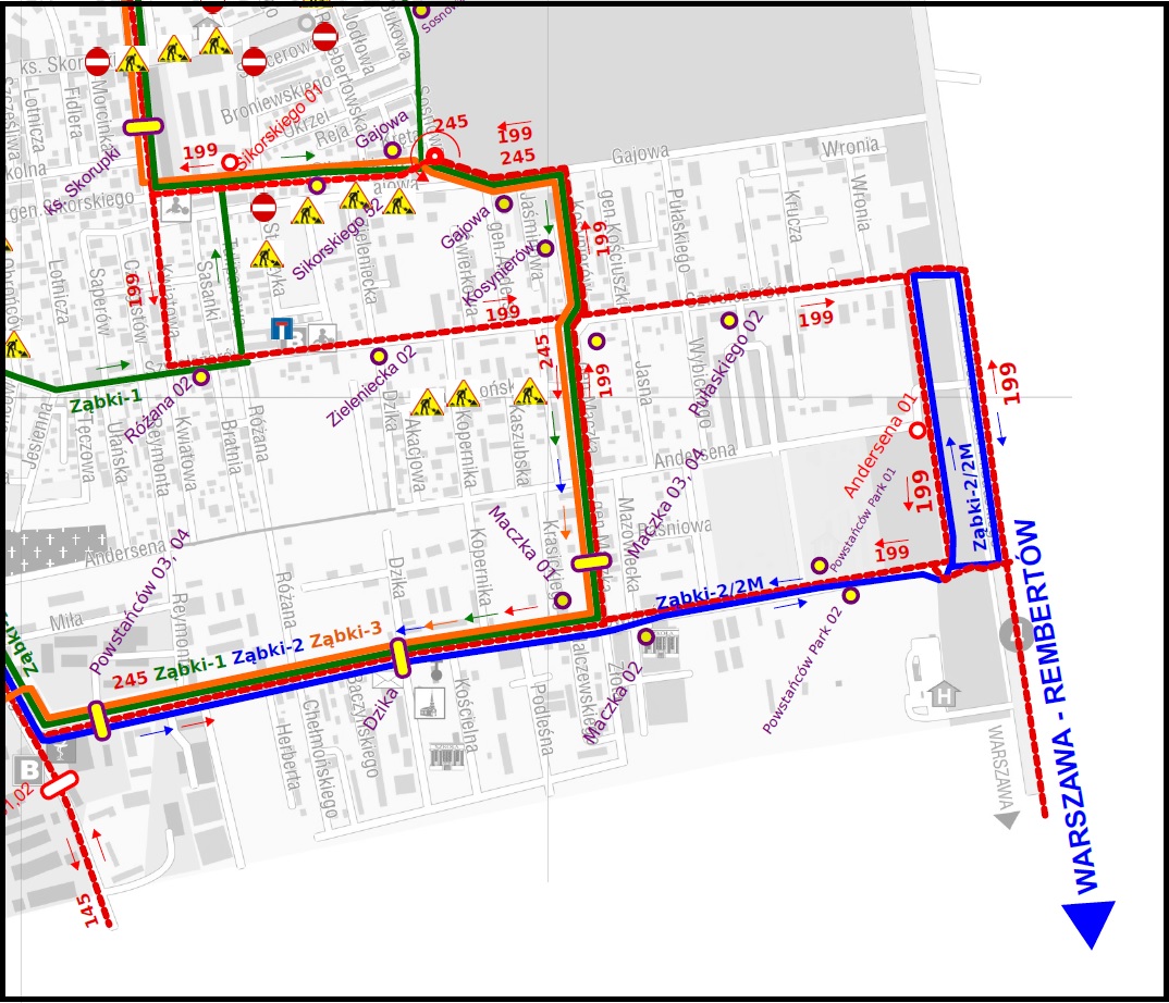 W związku z przebudową ulicy F. Stefczyka w Ząbkach i jej zamknięciem w rejonie skrzyżowania z ulicą Gajową od dnia 9 października 2023 r. (poniedziałek) do odwołania autobusy linii 199 zostają skierowane na trasę objazdową: