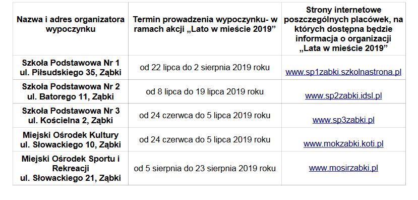 1.adresów placówek, które w okresie wakacji 2019 r. (w poniedziałki, wtorki, środy,czwartki, piątki) będą prowadziły wypoczynek dla dzieci i młodzieży w ramach akcji ,,Lato w mieście 2019″ na terenie Miasta Ząbki,