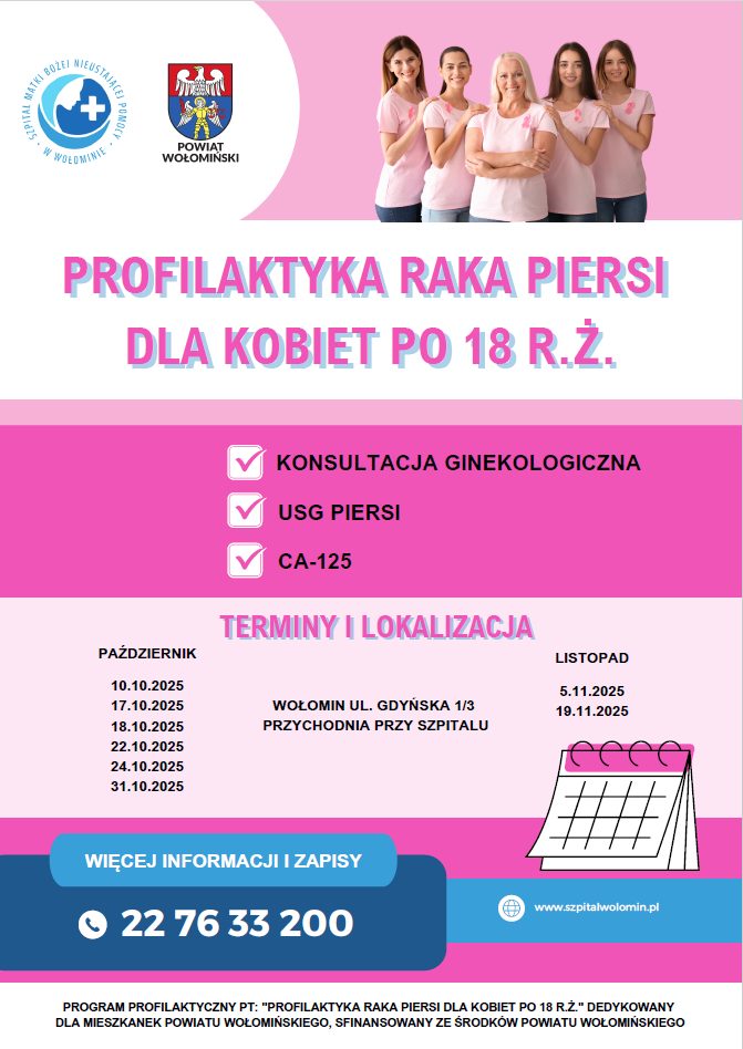 Szpital Matki Bożej Nieustającej Pomocy w Wołominie oraz Powiat Wołomiński zapraszają wszystkie kobiety po 18. roku życia na bezpłatny program profilaktyki raka piersi.