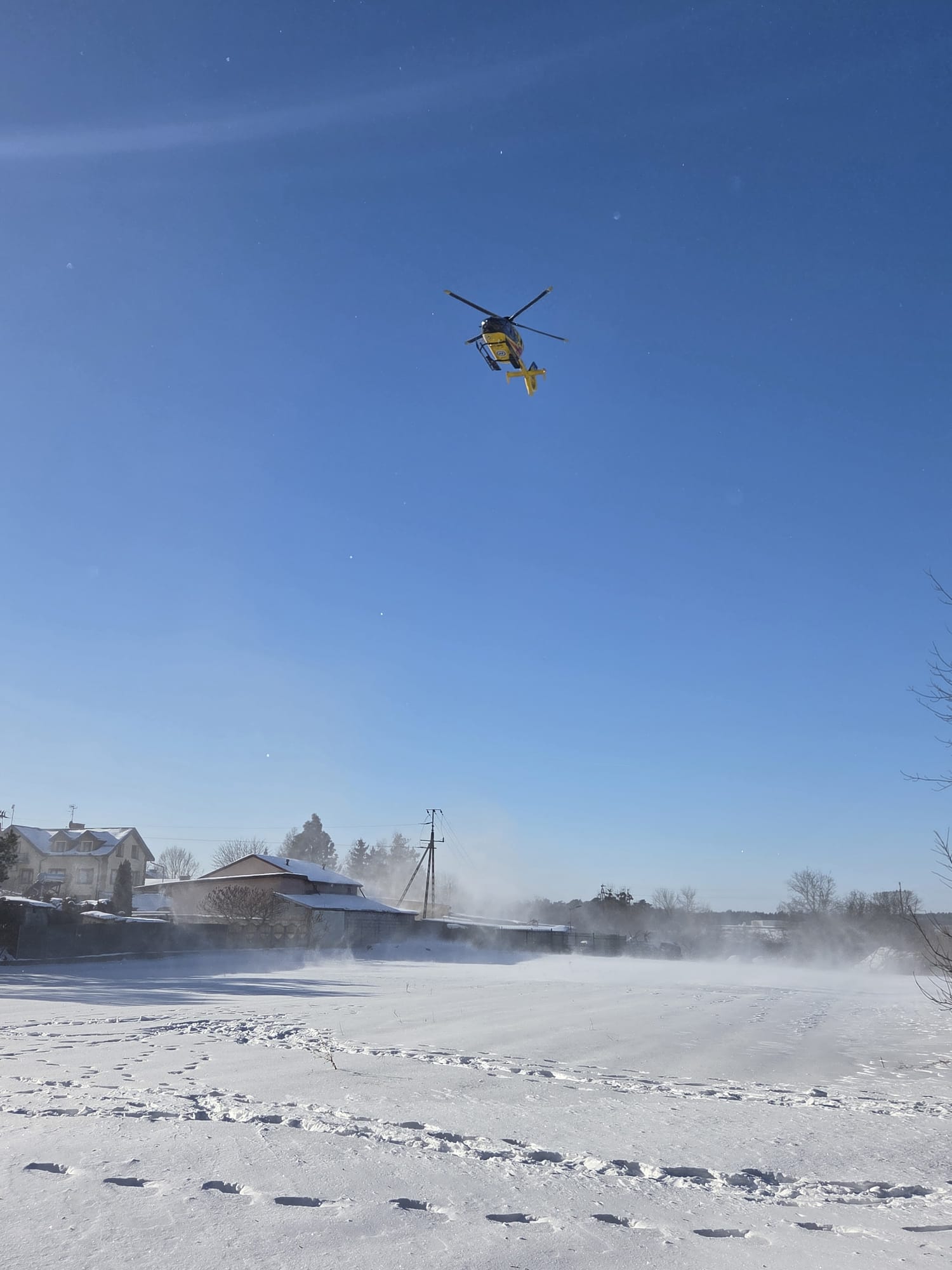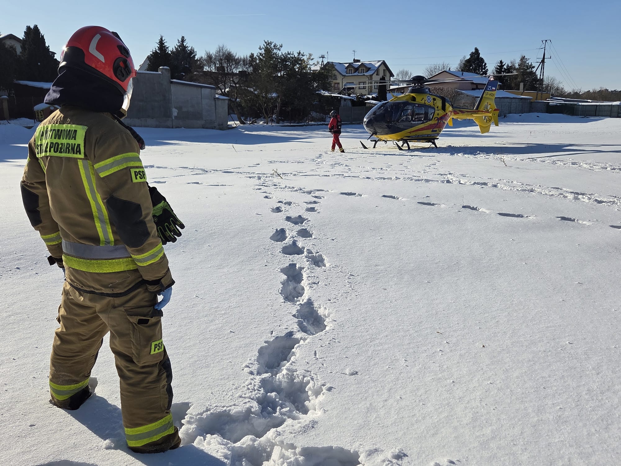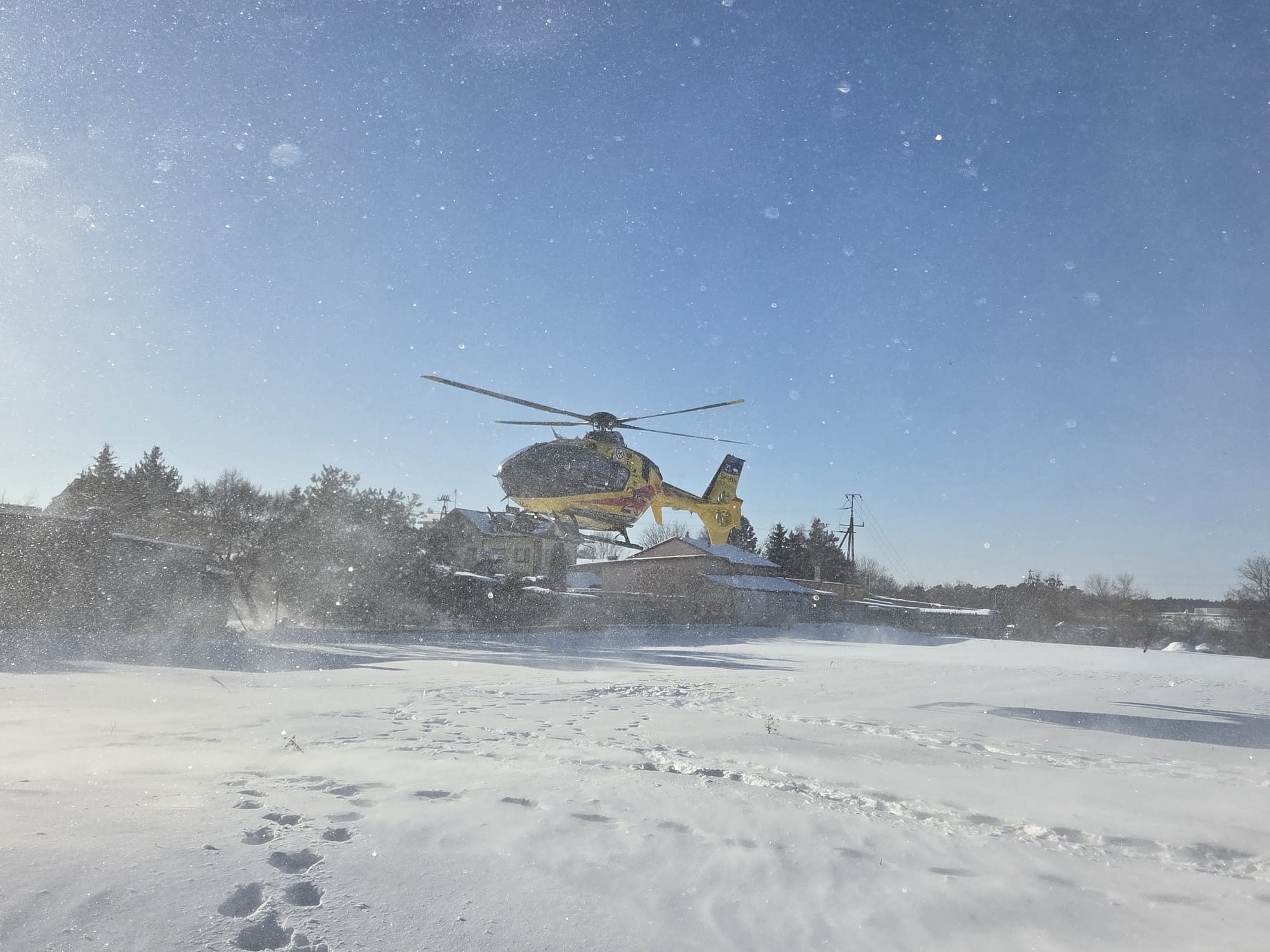 Na zdjęciach widać moment lądowania i pracy załogi LPR na zaśnieżonym terenie, a także działania służb ratowniczych, które zabezpieczały miejsce zdarzenia i umożliwiały sprawne przeprowadzenie medycznej ewakuacji poszkodowanej.