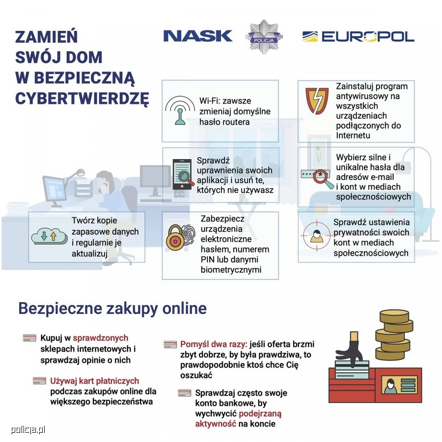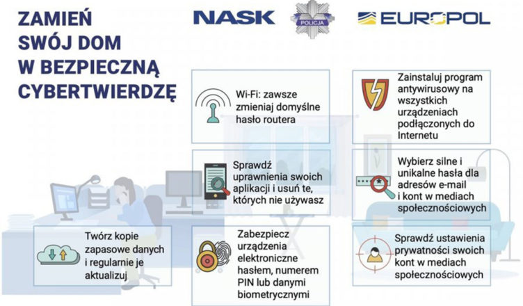 Biuro do Walki z Cyberprzestępczością KGP we współpracy z NASK (Naukową i Akademicką Siecią Komputerową) oraz Europolem przypominają o najważniejszych zasadach cyberbezpieczeństwa. #zostanwdomu to czas aktywnego korzystania z Internetu. Wiążą się z tym możliwości zdalnych zakupów czy kontaktu z bliskimi i znajomymi, ale to także przestrzeń aktywności oszustów. Warto zadbać o swoje bezpieczeństwo w sieci.