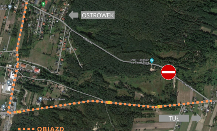 5 lutego 2024 r. Wykonawca rozpocznie prace na moście łączącym miejscowości Ostrówek i Tuł. W związku z powyższym wprowadzona zostaje zmiana organizacji ruchu i przejazd ul. Kolejową w Ostrówku do ul. Papczyńskiego w Tule, będzie zamknięty.