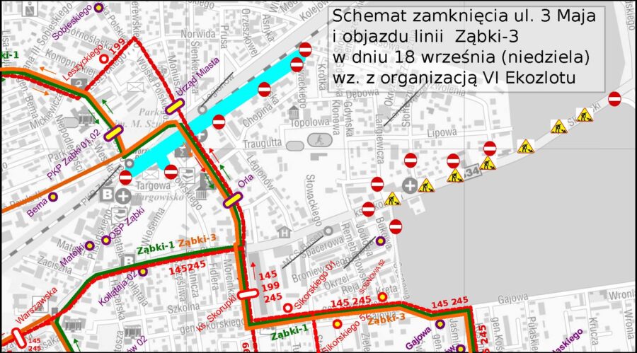 W związku z zamknięciem ul. 3 Maja w dniu 18 września (niedziela) linia Ząbki-3 będzie kursowała objazdem ul. Orlą z pominięciem przystanków PKP Ząbki 03 i Kołłątaja 02. Na trasie objazdu autobus będzie zatrzymywać się na przystanku „Orla 02” na ul. Orlej. Przywrócenie stałej trasy linii Ząbki-3 nastąpi od godziny 20:00.