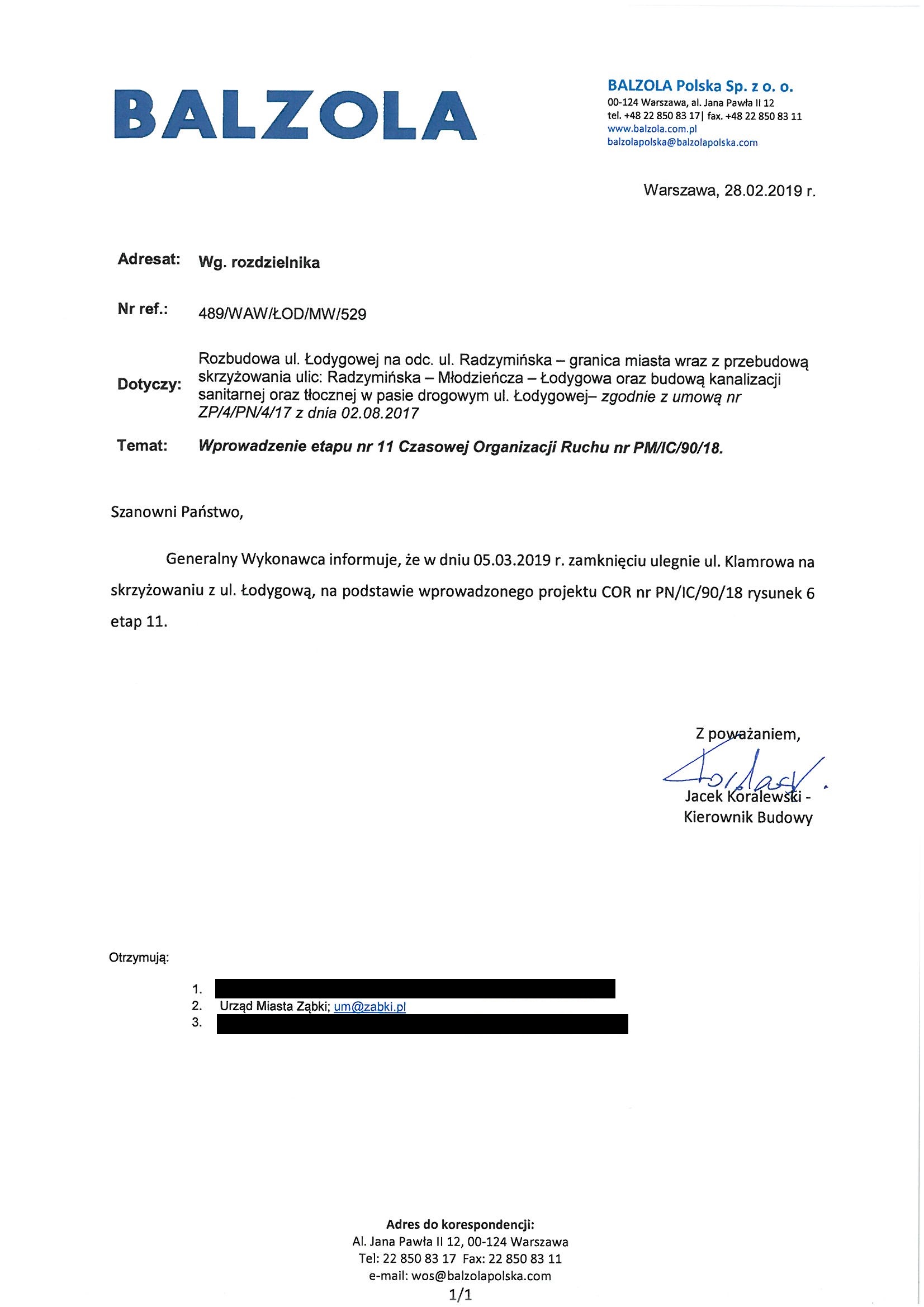 Generalny wykonawca przebudowy ulicy Łodygowej w Warszawie firma Balzola poinformowała, że w od 05.03.2019 (wtorek) zostanie zamknięta dla ruchu kołowego ul. Klamrowa przy skrzyżowaniu z ul. Łodygową (nie będzie wjazdu i wyjazdu na z i na ul. Łodygową). W tym czasie będzie przebudowywane włączenie ul. Klamrowej w ul. Łodygową.