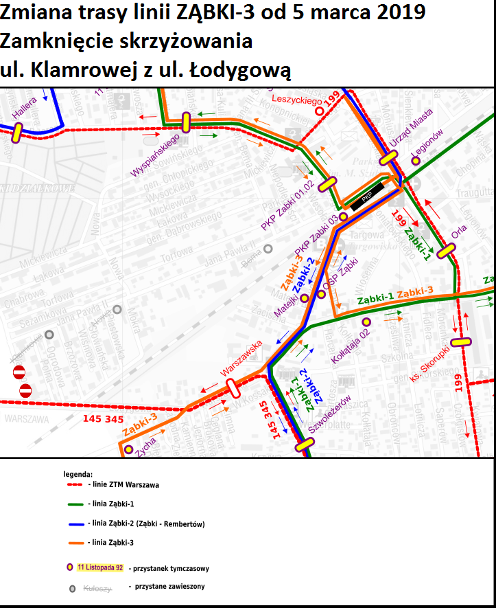 W związku z powyższym od wtorku 5 marca linia ?Ząbki-3? nie będzie mogła kursować ulicą Jana Pawła II i za przystankiem ?Zycha? zostanie skierowana na objazd ulicami: Warszawską, Piłsudskiego, 3 Maja, tunel, Wojska Polskiego, Kolejową i od przystanku ?PKP Ząbki 01? na ul. Batorego gdzie wróci na stałą trasę.