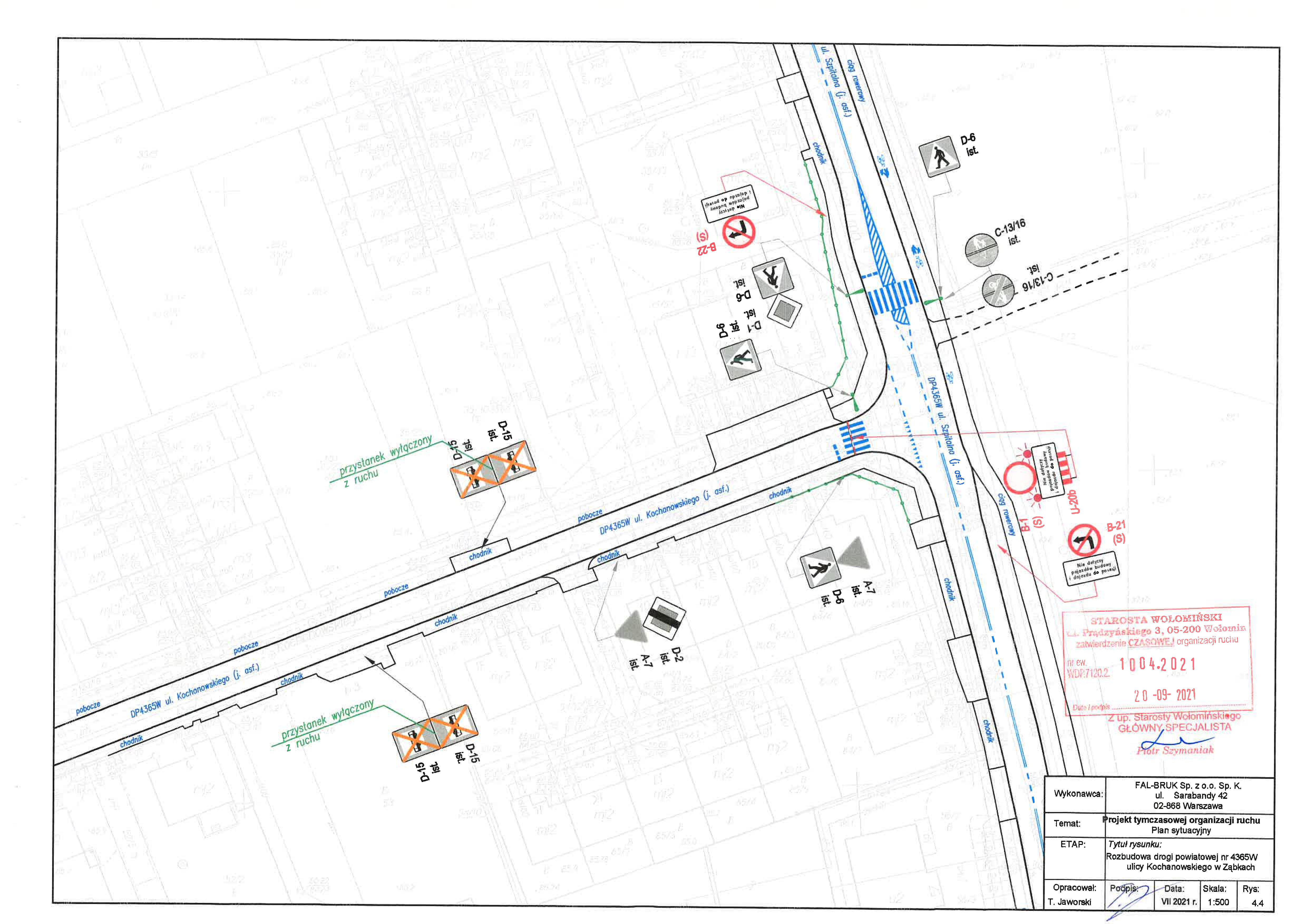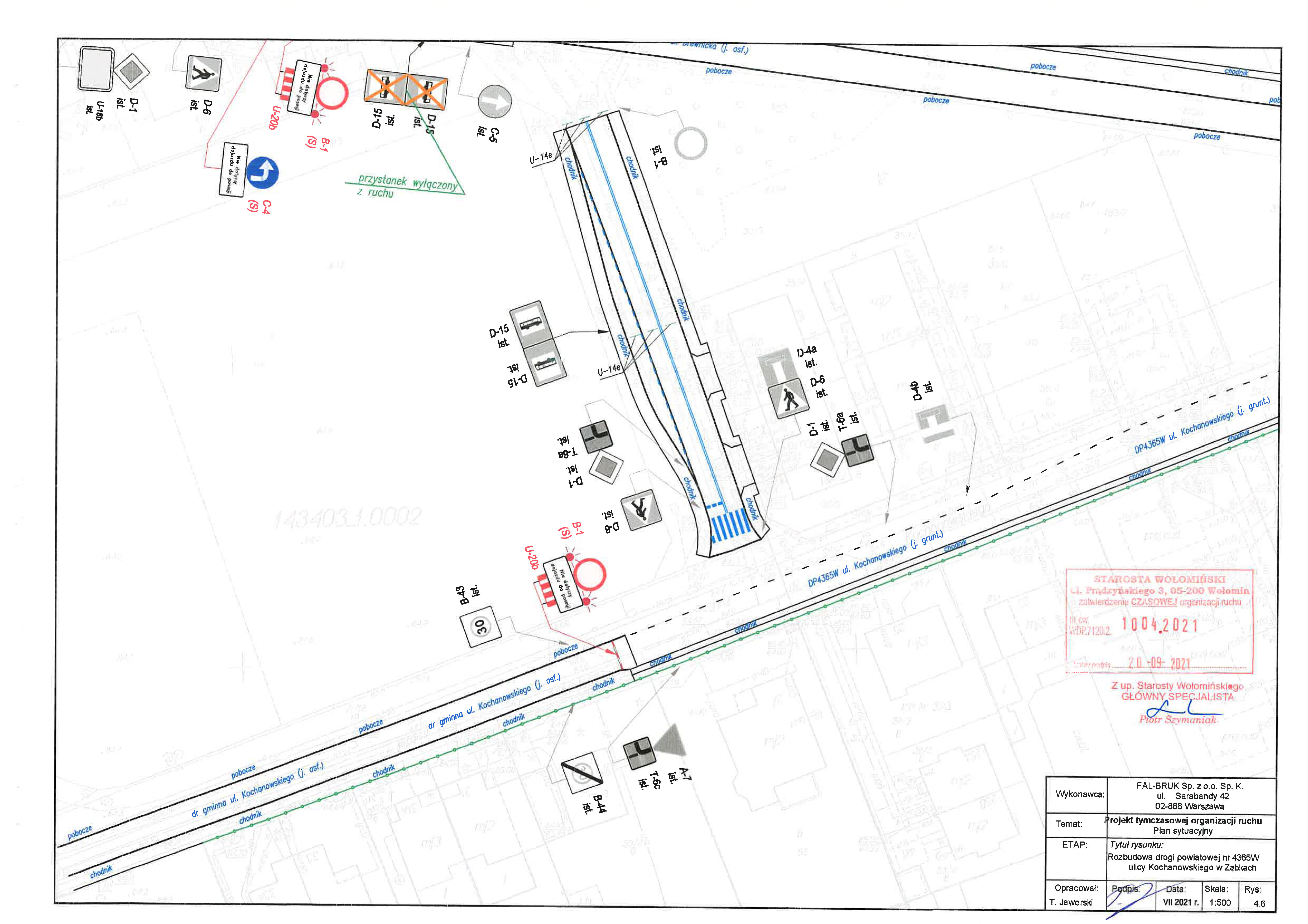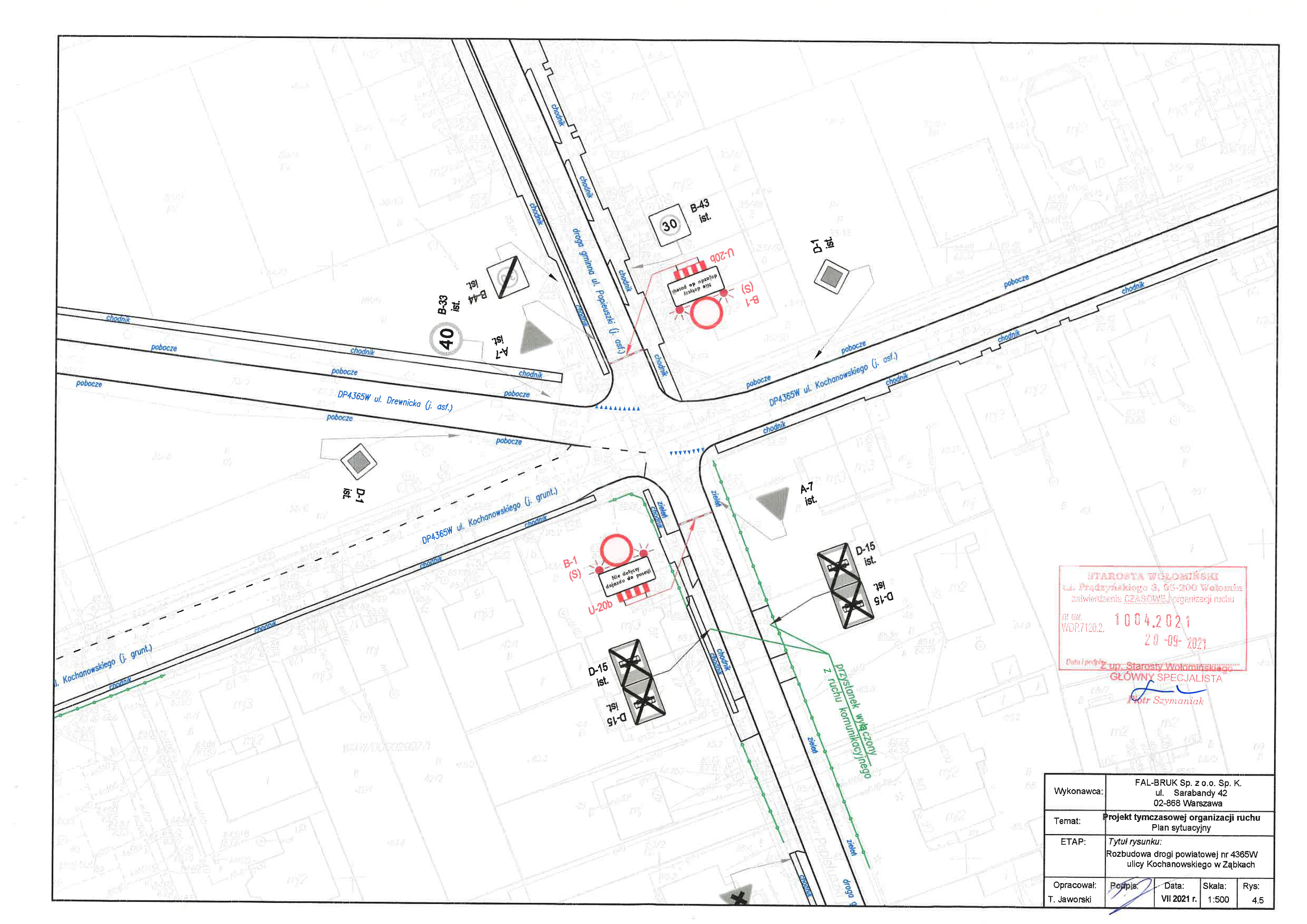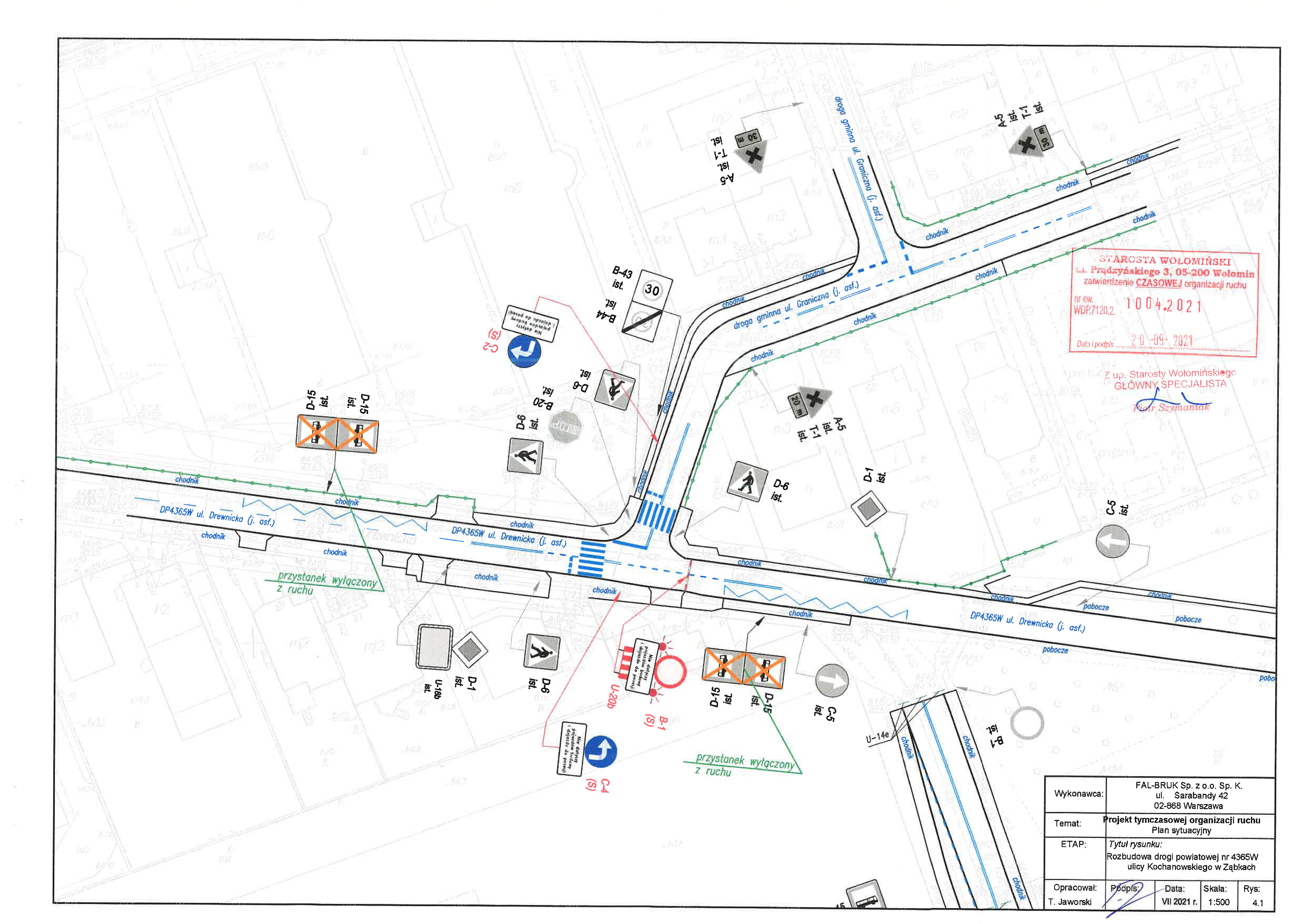Firma Fal-Bruk realizująca na zlecenie Powiatu Wołomińskiego przebudowę ul. Kochanowskiego poinformowała, że od dnia 27 września 2021 (poniedziałek) zamknie dla ruchu część ciągu ulic Kochanowskiego i Drewnickiej na podstawie projektu zatwierdzonej czasowej organizacji ruchu .
