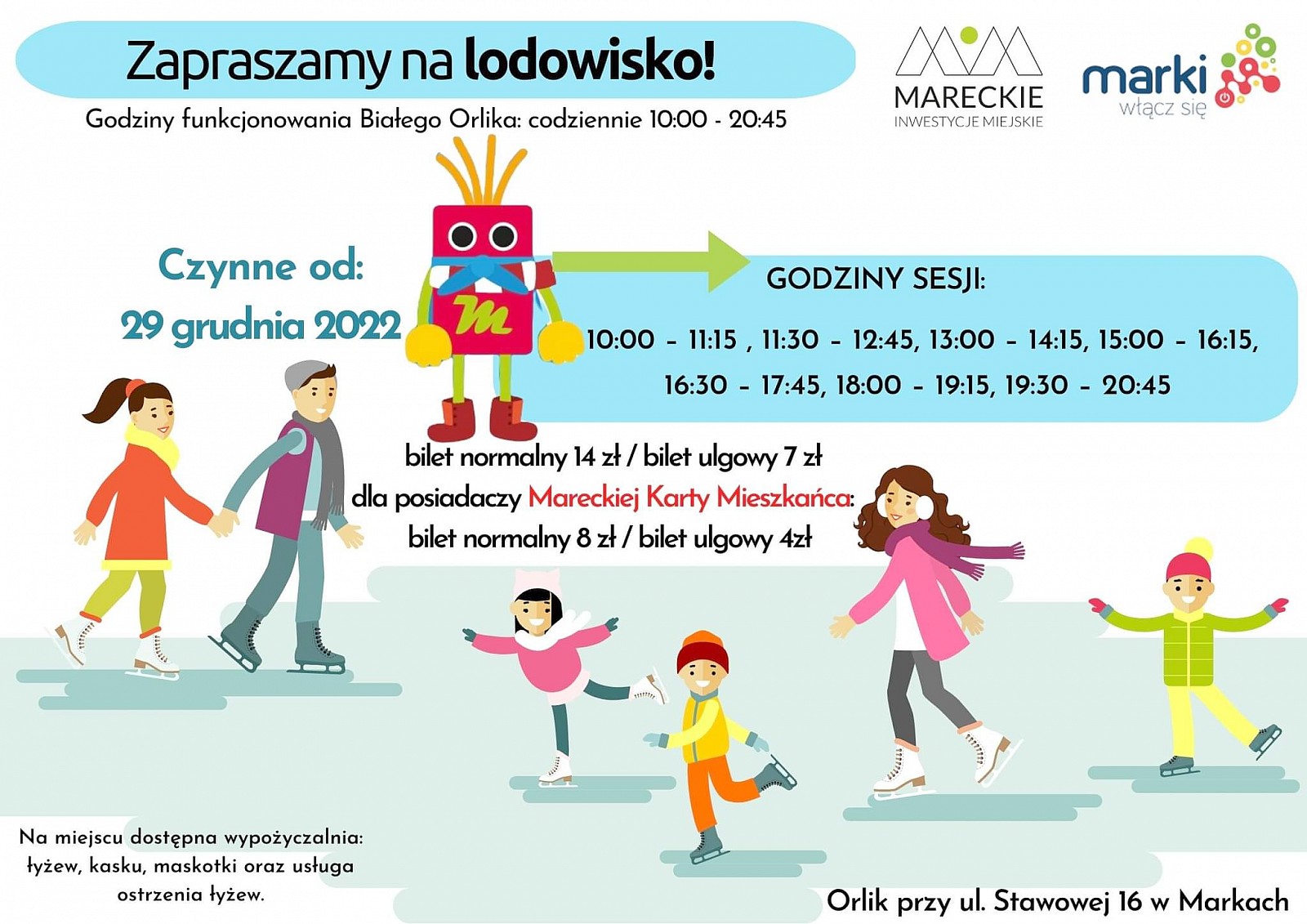 Mieszkańcy Marek, którzy mają ważną Marecką Kartę Mieszkańca (MKM), będą płacić mniej. Dzieci z MKM zapłacą 4 zł za wejście na sesję (maksymalnie 75 minut jazdy), a dorośli – 8 zł. Osoby, które nie mają mareckiej karty, zapłacą więcej: dzieci – 7 zł, dorośli – 14 zł. Dla mieszkańców Marek będzie tańsze również wypożyczenie łyżew czy maskotki do jazdy. Aby nie nosić gotówki w kieszeni, będzie można regulować opłaty kartą.