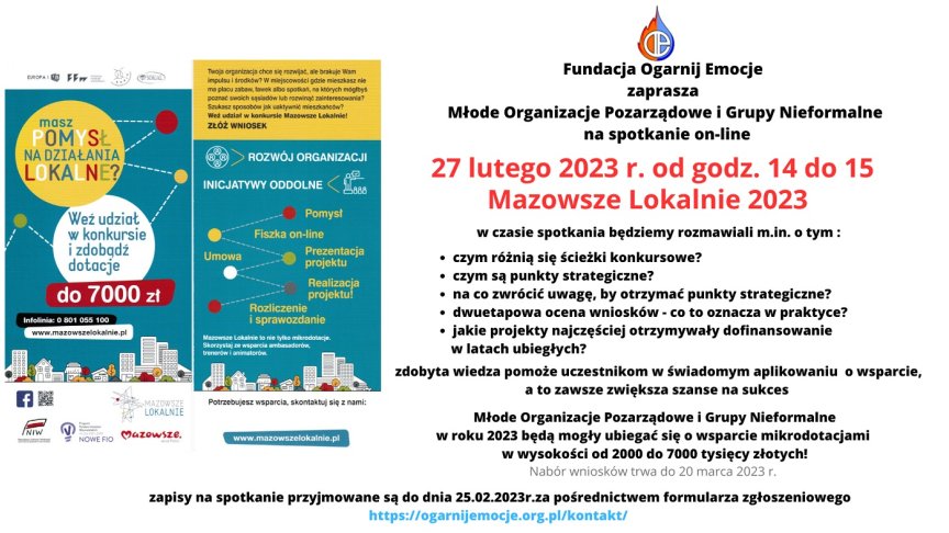 Fundacja Ogarnij Emocje jako Ambasador Mazowsze Lokalnie zaprasza młode organizacje pozarządowe oraz grupy nieformalne i samopomocowe do udziału w konkursie Mazowsze Lokalnie 2023.
