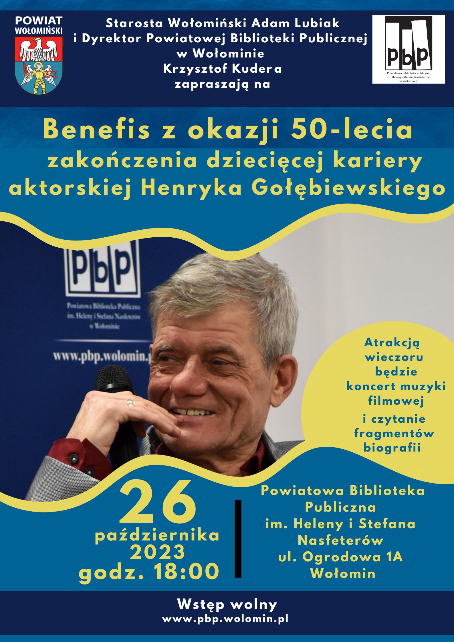 Powiatowa Biblioteka Publiczna im. Heleny i Stefana Nasfeterów w Wołominie zaprasza na benefis twórczości aktora Henryka Gołębiewskiego. Wydarzenie uświetni koncert muzyki filmowej i czytanie biografii aktora.