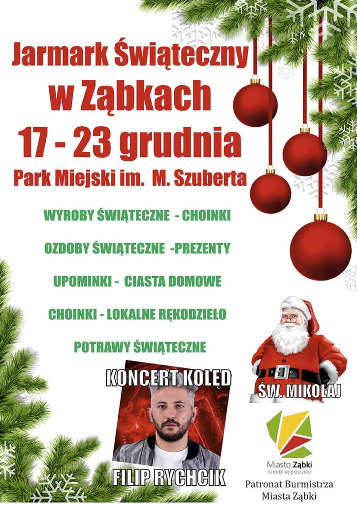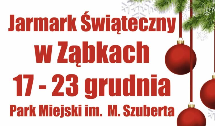 W dniach 17-23 grudnia br.  w Parku Miejskim w Ząbkach odbędzie się Jarmark Świąteczny. Na jarmarku będzie można nabyć  świąteczne produkty w tym rękodzieło oraz lokalne wyroby a także choinki. Będzie można wypić „grzańca” a także zrobić świąteczne zakupy.