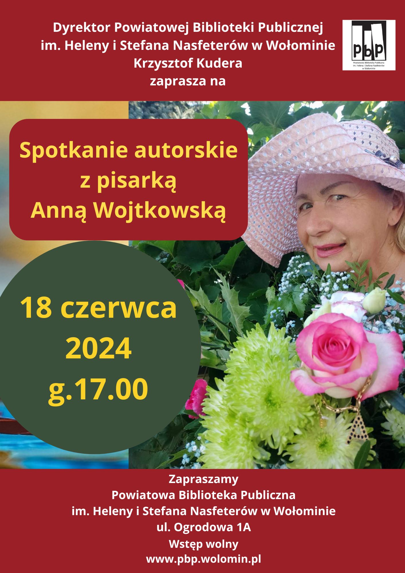 Zapraszamy na spotkanie autorskie z pisarką wołomińską Anną Wojtkowską, w dniu 18 czerwca 2024 r. (wtorek), o godz. 17.00, do Powiatowej Biblioteki Publicznej im. Heleny i Stefana Nasfeterów w Wołominie ul. Ogrodowa 1A.