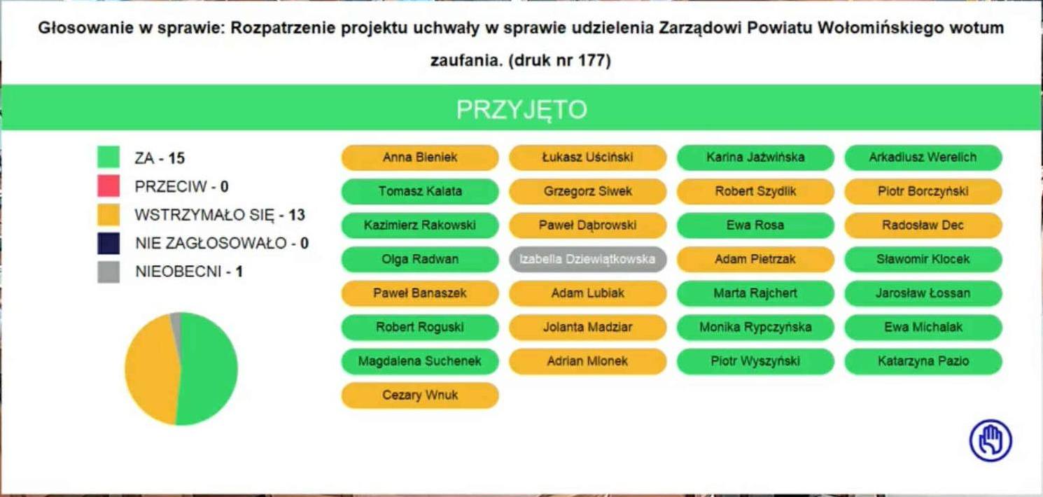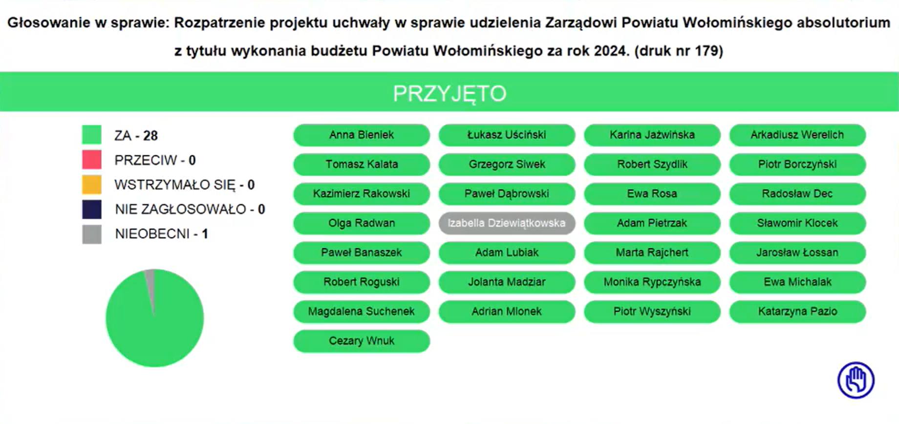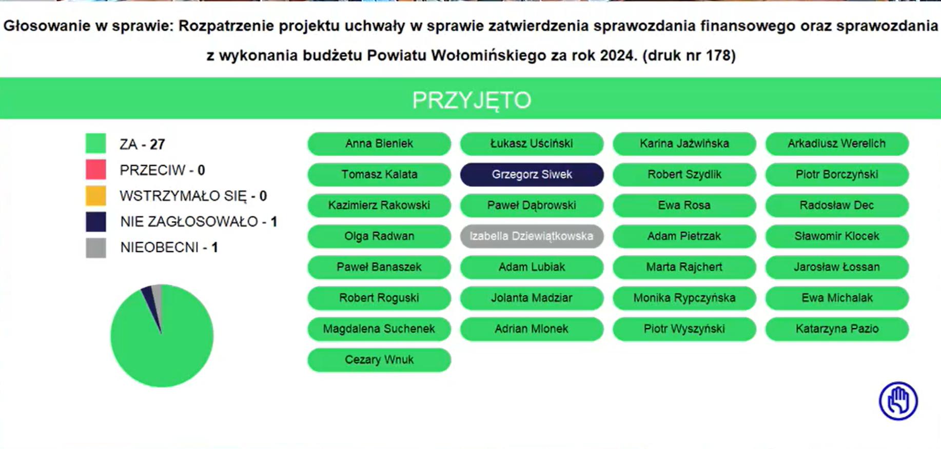 25 czerwca odbyło się posiedzenie Rady Powiatu, w trakcie którego radni powiatowi udzielili wotum zaufania dla Zarządu Powiatu Wołomińskiego oraz zagłosowali za absolutorium za 2024 rok.