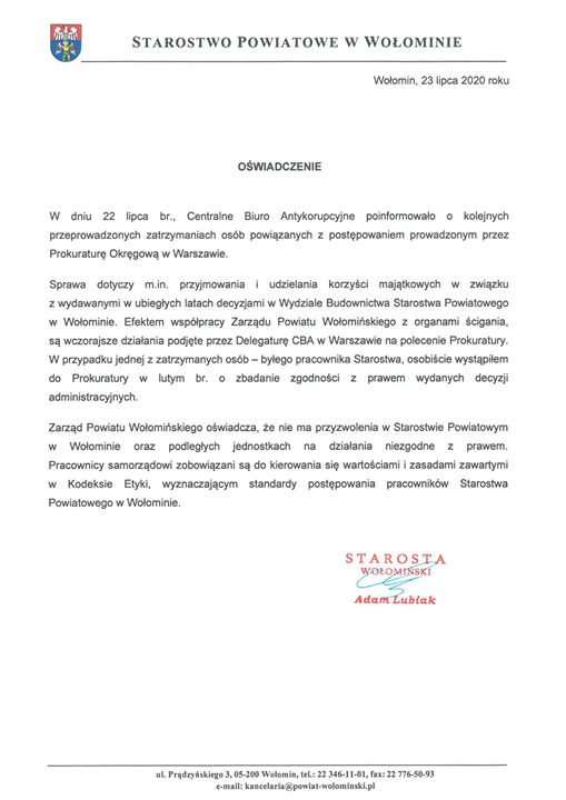 23 lipca 2020 roku Starosta Wołomiński, Adam Lubiak, opublikował oświadczenie dotyczące zatrzymań byłych pracowników wydziału budownictwa starostwa oraz Powiatowego Inspektoraty Budownictwa w Wołominie.
