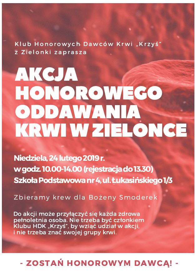 Klub Honorowych Dawców Krwi ?Krzyś? serdecznie zaprasza wszystkich Krwiodawców, chętnych, wraz z rodzinami i bliskimi, do czynnego udziału w pierwszej w tym roku akcji honorowego oddawania krwi, która odbędzie się w niedzielę, 24 lutego 2019 r. w godz. 10:00 ? 14:00 w gościnnych murach Szkoły Podstawowej nr 4 (ul. Łukasińskiego 1/3)