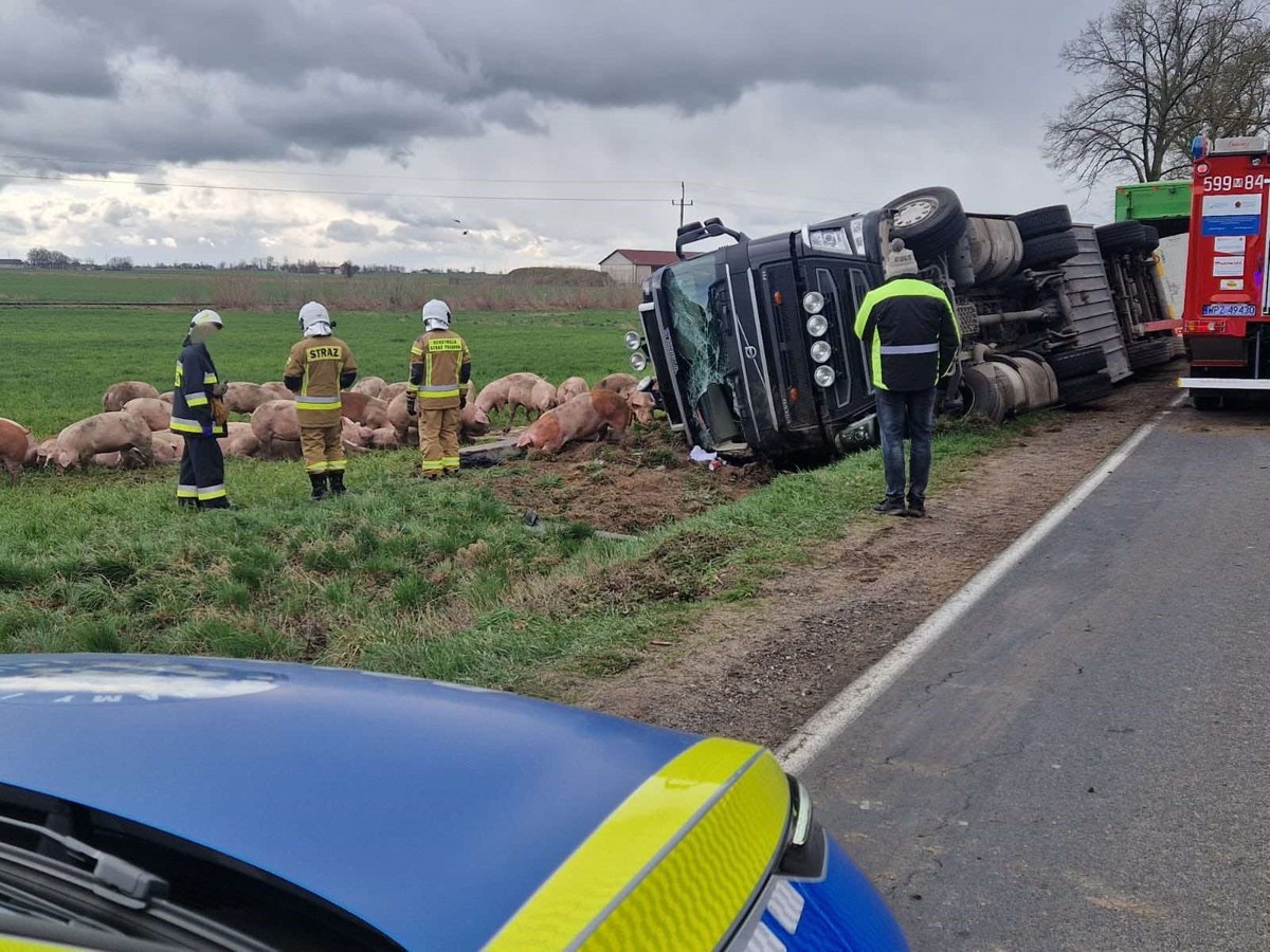 Wczoraj (10.04) w miejscowości Klewki w pow. przasnyskim doszło do groźnego zdarzenia drogowego z udziałem ciężarówki przewożącej trzodę chlewną. Na miejscu przez wiele godzin pracowali policjanci, strażacy, powiatowy lekarz weterynarii oraz inne służby, które zabezpieczały teren i zwierzęta.