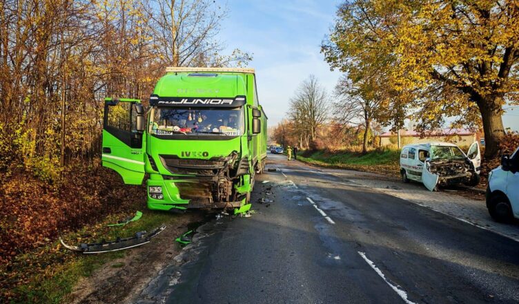 Zderzenie czołowe samochodu ciężarowego z małym busem. Jeden z kierujących w stanie ciężkim został przewieziony do szpitala