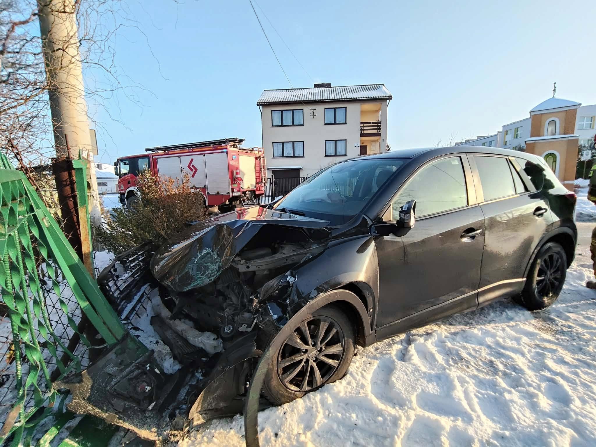 Po przybyciu pierwszych zastępów oczom ratowników ukazał się dramatyczny widok. Jeden z pojazdów, z ogromną siłą, wypadł z drogi i uderzył w ogrodzenie prywatnej posesji, zatrzymując się na zaśnieżonym poboczu. Przód samochodu został poważnie zniszczony – zdeformowana maska, rozbite elementy karoserii i widoczne uszkodzenia konstrukcyjne świadczyły o sile uderzenia. Drugi pojazd również nosił ślady kolizji i blokował część jezdni.