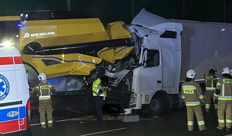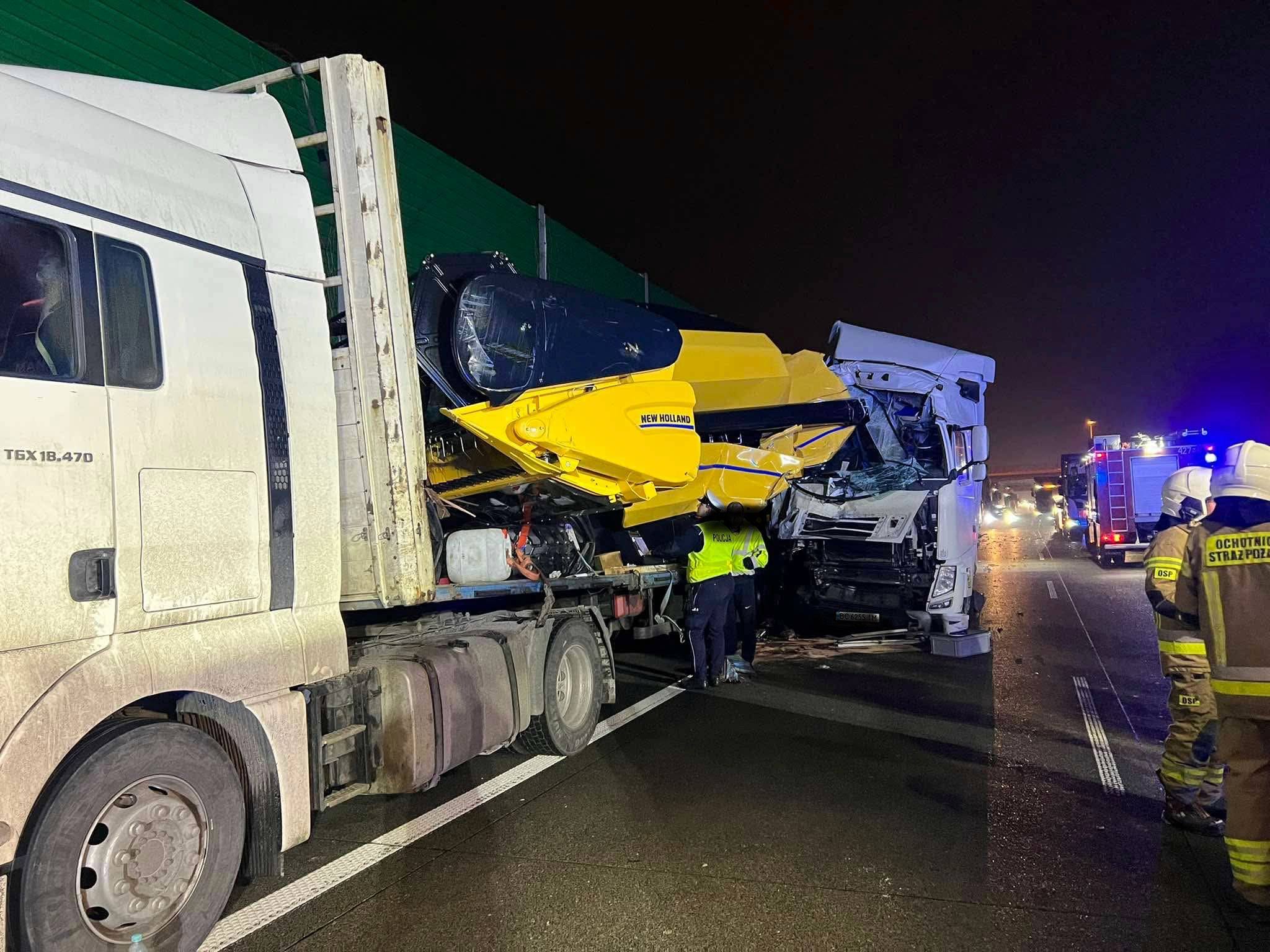 Po dojeździe na miejsce strażacy zastali poważnie uszkodzony zestaw ciężarowy, w którym doszło do zderzenia i uszkodzenia przewożonego ładunku. Siła uderzenia była znaczna — elementy transportowanej maszyny rolniczej znalazły się w niebezpiecznym położeniu, a kabina pojazdu uległa poważnym zniszczeniom. Zdarzenie spowodowało utrudnienia w ruchu i wymagało natychmiastowych działań ratowniczych.
