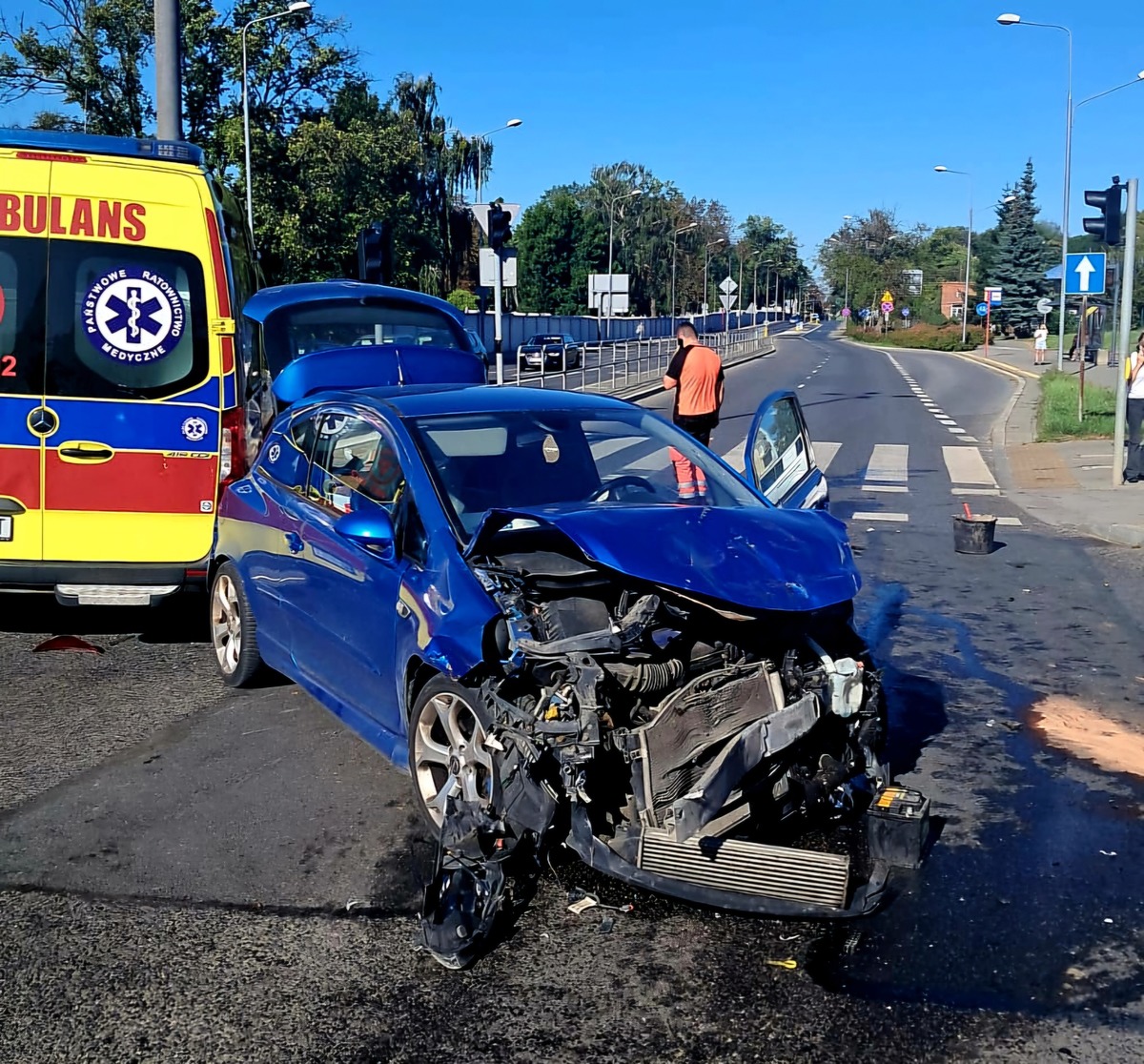 Oficer dyżurny Komendy Miejskiej Policji w Radomiu przed godz. 15 otrzymał zgłoszenie o wypadku na skrzyżowaniu ulic Limanowskiego i Maratońskiej. Ze wstępnych ustaleń policjantów wynika, że karetka, którą kierował 45-latek jechała od ulicy Starokrakowskiej mając włączone sygnały uprzywilejowania. Doszło do zderzenia z pojazdem marki Opel, którym kierowała 55-latka i jechała od ulicy 1905 Roku. W wyniku zderzenia karetka uderzyła jeszcze w słup oświetleniowy oraz znak drogowy, którego części uszkodziły pojazd marki Bmw czekający przed sygnalizacją świetlną.
