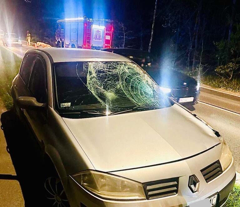W sobotę 13 kwietnia wieczorem doszło do bardzo niebezpiecznego zdarzenie drogowego przy ulicy Watykańskiej w miejscowości Majdan (gmina Wołomin). Wprost pod jadące auto osobowe marki Renault wybiegł duży łoś. Kierowca nie zdołał wyhamować, ani ominąć zwierzęcia. Doszło do mocnego uderzenie.