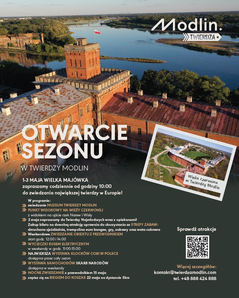 Tradycyjnie już Twierdza Modlin inauguruje sezon turystyczny w swoich murach właśnie w majówkę. W tym czasie na dużych i małych pasjonatów historii oraz miłośników aktywnego wypoczynku czeka bogaty program i liczne atrakcje dla całej rodziny. Dostępne będą zwiedzanie Twierdzy z przewodnikiem, wycieczki elektrycznym busem czy strefa zabaw dla najmłodszych. Prócz możliwości zwiedzenia samego Muzeum Twierdzy Modlin – Prochownia 197, wiosna to między innymi możliwość skorzystania z wystaw czasowych takich jak ekspozycja samochodów Skarb Narodu czy największa wystawa klocków COBI o tematyce batalistycznej i historycznej. Budząca się do życia przyroda to również świetna okazja do skorzystania z punktów widokowych m.in. na Wieży Czerwonej, z widokiem na zbieg rzeki Wisły i Narwi.