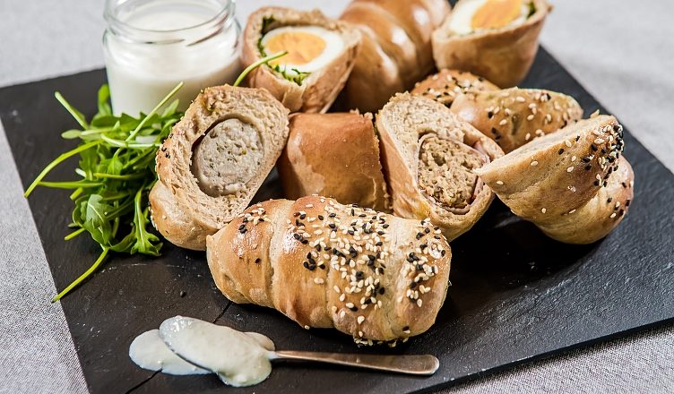 Na każdym kawałku ułożyć różne dodatki, następnie ?zawinąć? w ciasto. Brzegi ciasta dokładnie ze sobą zlepić, ułożyć na blasze wyłożonej papierem do pieczenia. Odstawić do kolejnego wyrastania na około 15 min. Piec w rozgrzanym piekarniku przez 20-25 min w temperaturze 200°C. Chrzan wymieszać ze śmietaną. Wypieki podawać z sosem.