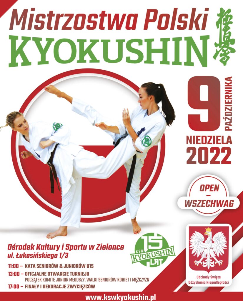 Klub Sportów Walki KYOKUSHIN zaprasza na Mistrzostwa Polski KYOKUSHIN, które zostaną rozegrane pod patronatem Polskiego Związku Karate w Zielonce. W tych prestiżowych rozgrywkach prowadzonych w formie dużej Gali Sportów Walki będą rywalizować mężczyźni i kobiety w otwartej kategorii wagowej OPEN bez podziału na kategorie wagowe z jednym triumfatorem wśród kobiet i mężczyzn.
