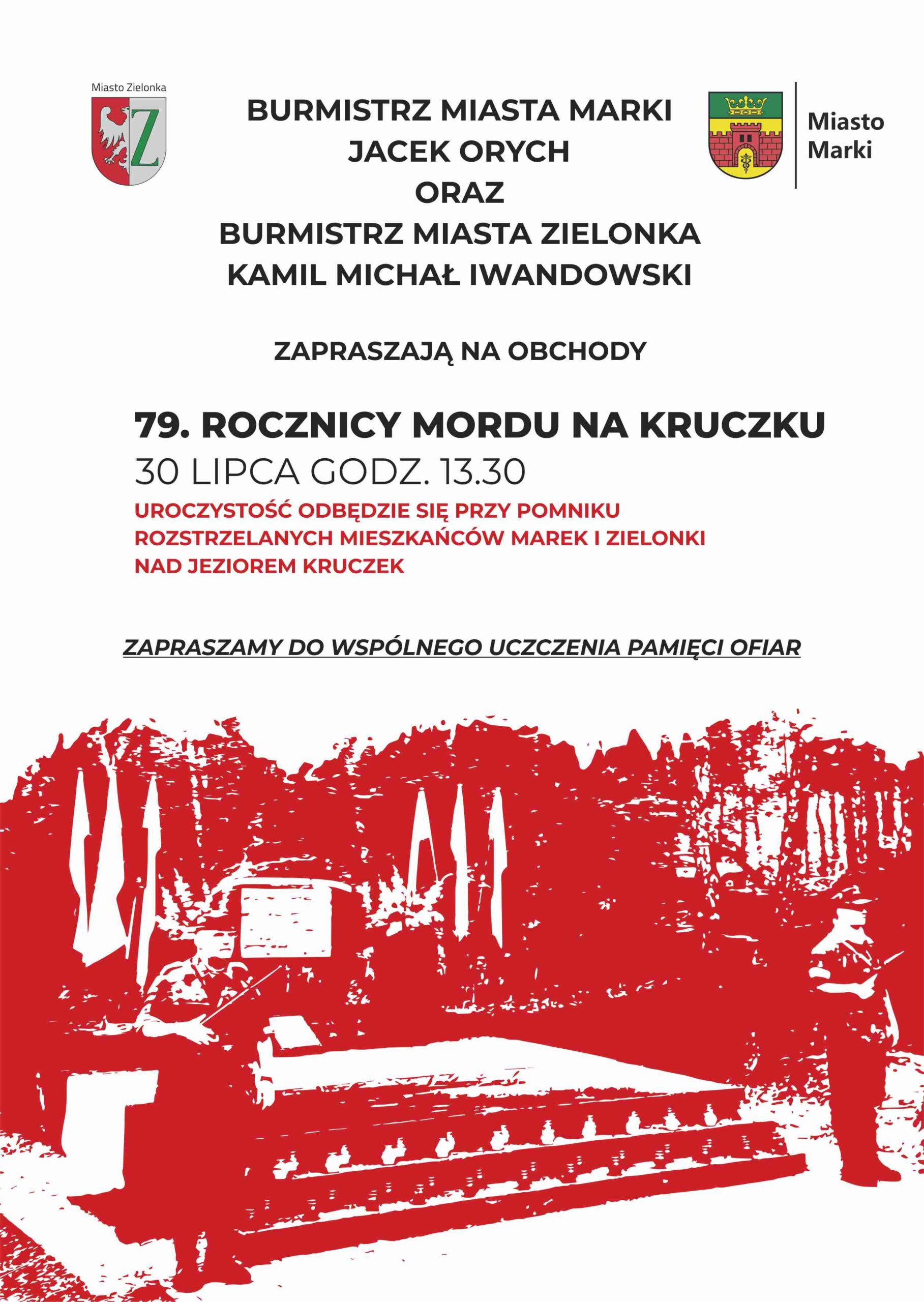 Burmistrz Miasta Zielonka Kamil Michał Iwandowski i burmistrz Marek Jacek Orych zapraszają do wspólnych obchodów 79. rocznicy mordu na Kruczku w niedzielę, 30 lipca o godzinie 13:30. – Spotykamy się przy pomniku pomordowanych w 1944 roku mieszkańców Marek i Zielonki przy jeziorku Kruczek, gdzie wspólnie złożymy wieniec od społeczności Miast Zielonka i Marki – zachęcają organizatorzy obchodów
