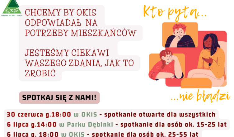 Wypowiedzieć się można na kilka sposobów. Pracownicy OKiS realizują sondę uliczną, podczas której będzie można podzielić się swoimi spostrzeżeniami na kierunki rozwoju Ośrodka. Dodatkowo, przygotowano specjalne miejsce na miejskich „okrąglakach„. Przede wszystkim jednak zachęcamy Państwa do wzięcia udziału w spotkaniach warsztatowych.