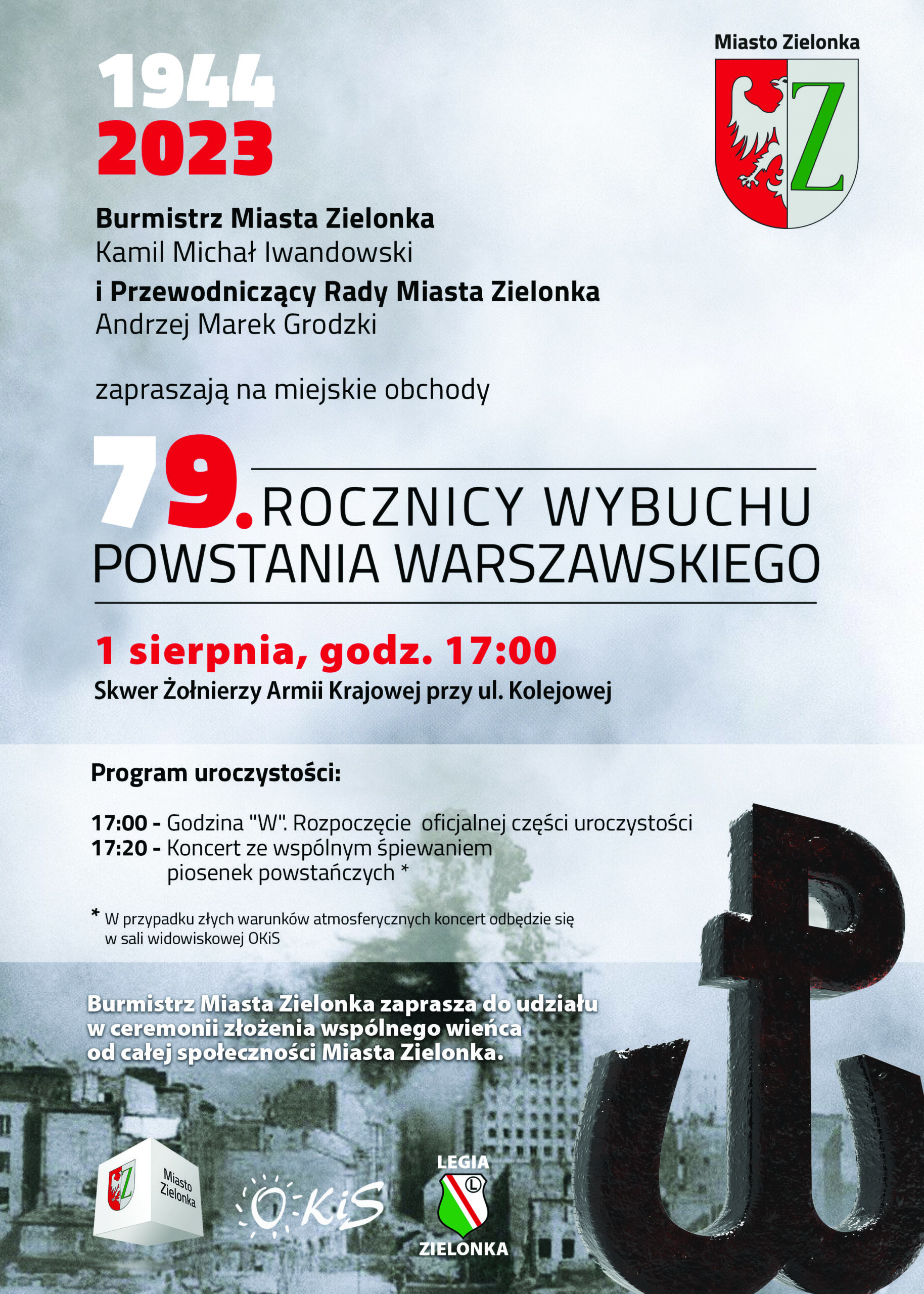 Burmistrz Miasta Zielonka Kamil Michał Iwandowski oraz Przewodniczący Rady Miasta Zielonka Andrzej Marek Grodzki zapraszają na miejskie obchody 79. rocznicy wybuchu Powstania Warszawskiego.