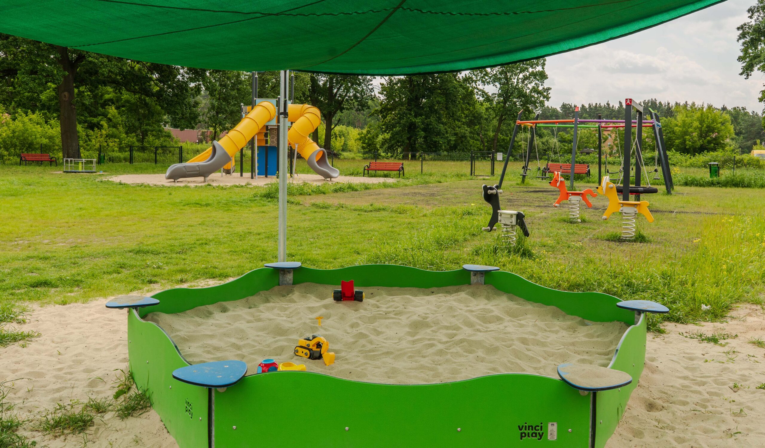 Nie mogło też zabraknąć piaskownicy – to jedno z tych miejsc, w których dzieci potrafią spędzać długie godziny na kopaniu, przesypywaniu i budowaniu. Została wyposażona w zadaszenie, by chronić najmłodszych przed słońcem – nawet w cieplejsze dni można się tu bawić komfortowo i bezpiecznie.