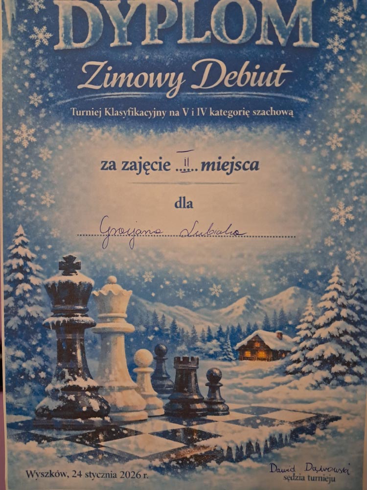 Są takie turnieje, które zapisują się w pamięci nie tylko wynikami, lecz przede wszystkim emocjami, atmosferą skupienia i pierwszymi, odważnymi krokami młodych zawodników na szachownicy. Dla części uczestników są one pierwszym poważnym sprawdzianem, pierwszym zapisem w osobistej historii turniejowej. Do takich właśnie wydarzeń należał turniej „Zimowy Debiut – Turniej Klasyfikacyjny na V i IV kategorię szachową”, który odbył się 24 stycznia 2026 r. w Szkole Podstawowej nr 3 w Wyszkowie przy ul. Stefana Batorego 6.