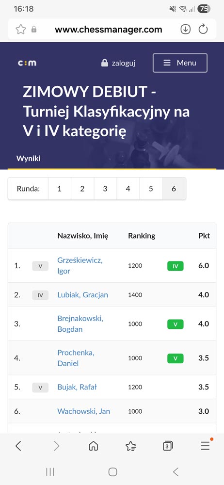 W tym wymagającym turnieju udział wzięli także nasi uczniowie. Zych Mikołaj, uczeń klasy czwartej, posiadający już III kategorię szachową, zaprezentował solidną i konsekwentną grę, zajmując 12. miejsce w końcowej klasyfikacji. Olszewski Miłosz, również uczeń klasy czwartej, podjął ambitną próbę zdobycia III kategorii szachowej i zakończył turniej na 17. miejscu.