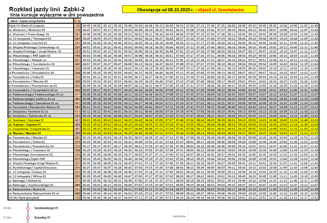 Linia będzie kursować wg. specjalnego rozkładu jazdy – odjazdy z przystanków autobusów wracających z Rembertowa (za przystankiem Żołnierska 01) zostały skorygowane.
