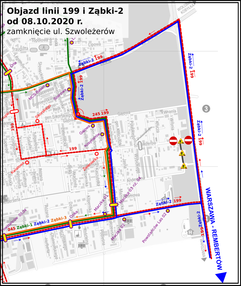 Od czwartku 8 października zostanie zamknięta ul. Szwoleżerów pomiędzy ul. Wronią, a DW 631. W związku z tym do odwołania zostaje zawieszone funkcjonowanie zespołu przystanków Pułaskiego 01 i 02. Linia Ząbki-2 w kierunku CH Marki zostanie skierowana na objazd ulicami DW 631, ul. ks. Skorupki, Sosnowa, Gajowa, Kosynierów i od przystanku Maczka 03 wróci na stałą trasę.