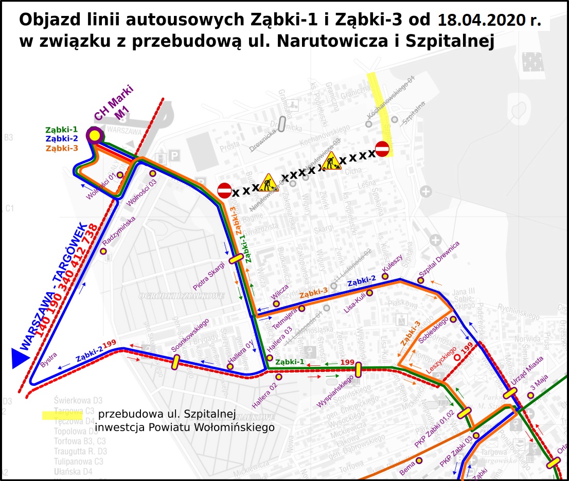 W związku z koniecznością wykonania prac związanych z rozkładaniem nawierzchni na ul. Narutowicza oraz nadal trwającą budową ul. Szpitalnej od dnia 18 kwietnia (sobota) od początku kursowania zmianie ulegają trasy linii ?Ząbki-1? i ?Ząbki-3? na północnych odcinkach tras.