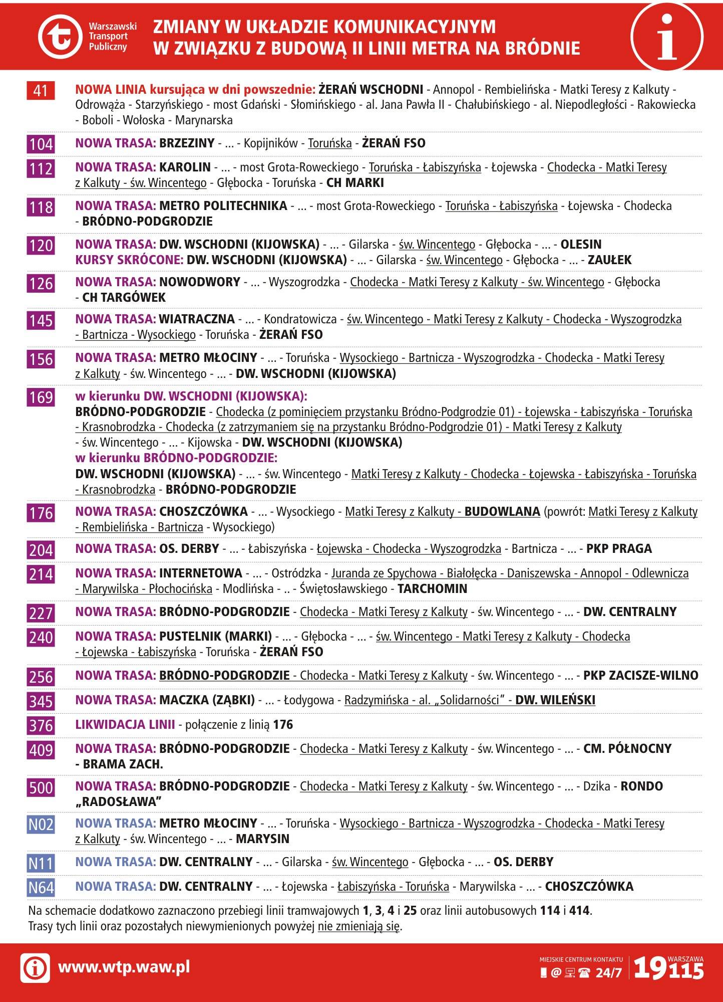 Z kolei ulicami Matki Teresy z Kalkuty i Chodecką pojadą autobusy linii: 227, 256, 409 i 500. Ze względu na możliwe utrudnienia w ruchu autobusy linii 176 będą miały pętlę na przystanku Budowlana. Jednocześnie likwidacji ulegnie linia 376.