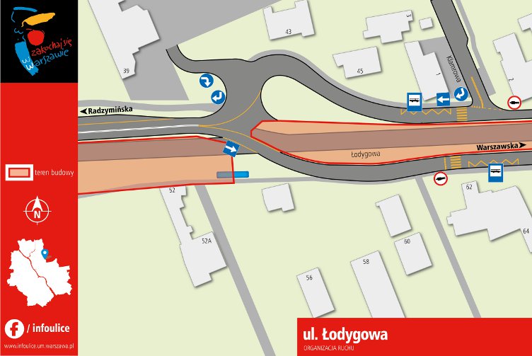 Na skrzyżowaniu z ul. Klamrową uruchomiono część relacji ? skrzyżowanie obecnie funkcjonuje ?na prawe skręty?. Nadal nie można skręcić w lewo z Łodygowej w Klamrową i w lewo z Klamrowej w stronę przejazdu kolejowego.