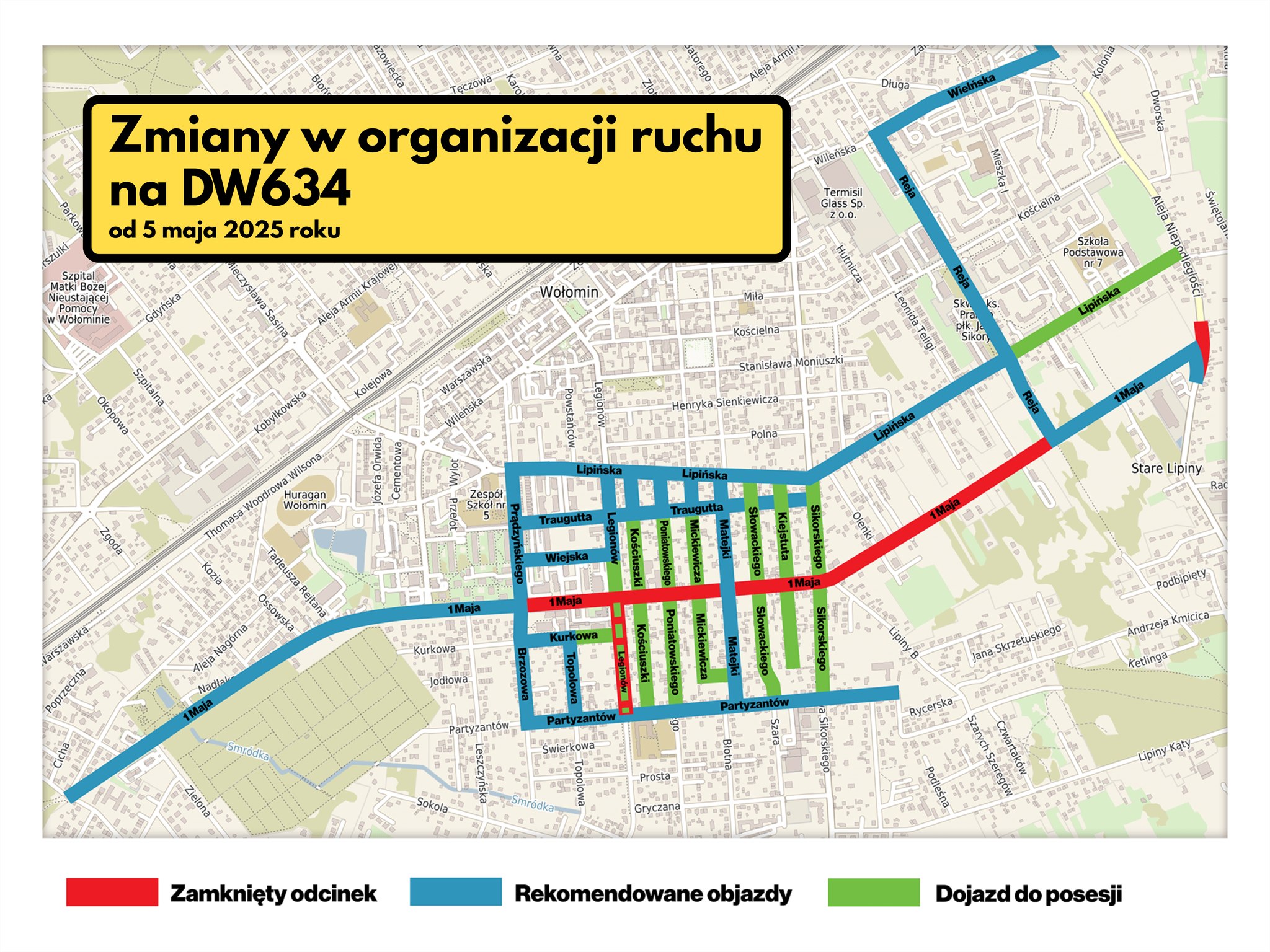 Wykonawca remontu DW634, realizowanego przez Mazowiecki Zarząd Dróg Wojewódzkich w Warszawie, poinformował o wyznaczeniu kolejnego nowego terminu wprowadzenia zmian w organizacji ruchu na ul. 1 Maja – 5 maja 2025 roku