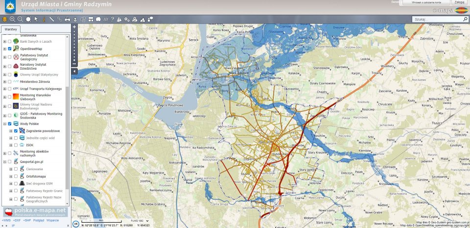 - Gminny System Informacji Przestrzennej E-mapa http://radzymin.e-mapa.net/ – dla interesującego nas obszaru należy w menu E-mapy włączyć warstwę ?Wody Polskie? i odpowiednie podwarstwy