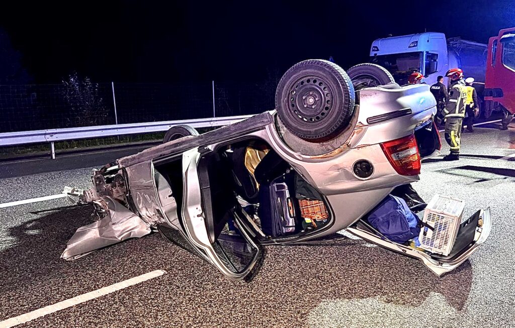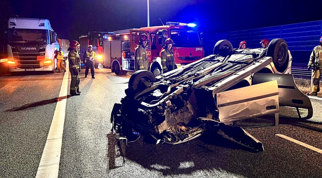 Zderzenie trzech samochodów na DK50. Jedno z aut dachowało.