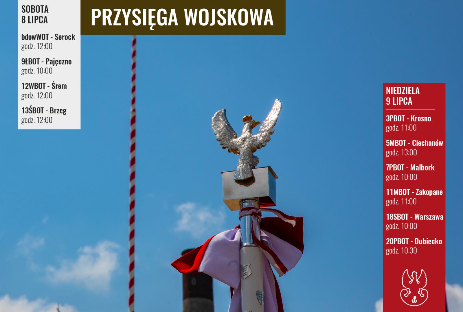 W batalionie dowodzenia Wojsk Obrony Terytorialnej żołnierze wypowiedzą słowa roty na rynku miejskim w Serocku o godz. 12:00. Przysięgać tego dnia będzie ponad 50 ochotników, z których najmłodszy ma 18 lat, a najstarszy 52 lata. Wśród ochotników są m.in.: dyrektor szkoły, właściciele firm, motorniczy tramwaju, paleontolog, maturzyści, studenci oraz prawnukowie żołnierzy walczących pod Monte Cassino i w Powstaniu Warszawskim. Przysięga połączona będzie z uroczystym wręczeniem Chorągwi Wojska Polskiego dowódcy Batalionu Dowodzenia WOT ppłk. Piotrowi Osińskiemu. Podczas wydarzenia obecny będzie Dowódca Terytorialsów – gen. bryg. Maciej Klisz.