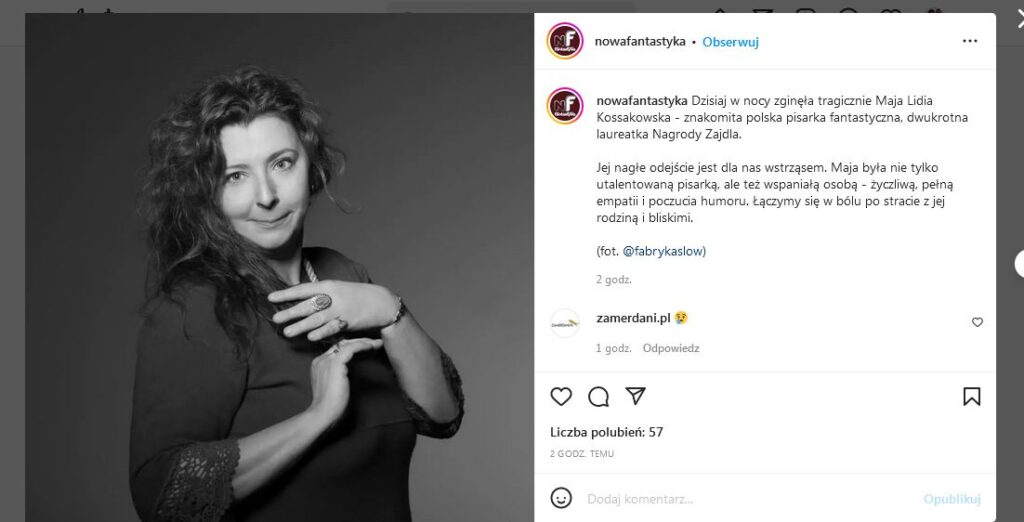 O śmierci pisarki informuje też na swoim instagramowym profilu Nowa Fantastyka.